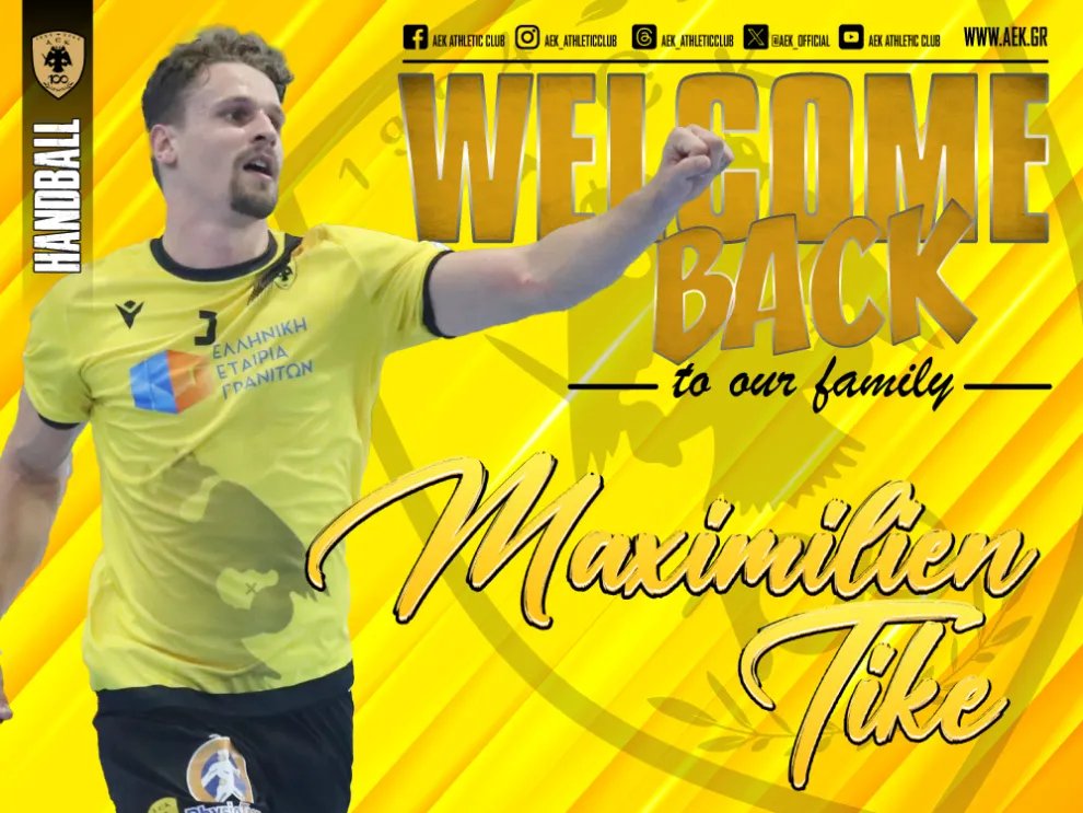 «Η ΑΕΚ βρίσκεται στην ευχάριστη θέση να ανακοινώσει την έναρξη της συνεργασίας της με τον Μαξιμίλιεν Τικ. Ο 30χρονος (03/09/1993) Γάλλος αριστερός εξτρέμ επιστρέφει στην ανδρική ομάδα Χάντμπολ, μετά από απουσία έξι μηνών.