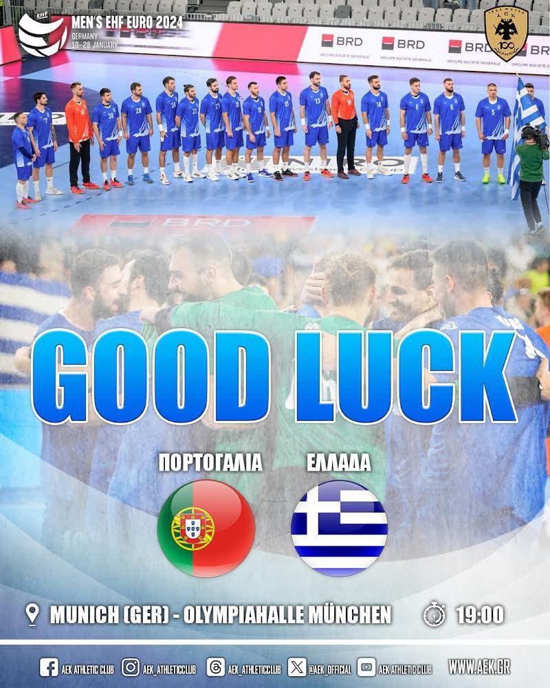 Η Εθνική ομάδα χάντμπολ των Ανδρών θα κάνει πρεμιέρα στο Ευρωπαϊκό Πρωτάθλημα του Μονάχου στη Γερμανία, απόψε Πέμπτη (11/01, 19:00-Cosmote Sports 8) για την 1η αγωνιστική του 6ου Ομίλου, με αντίπαλο την Πορτογαλία. Στην αποστολή της Εθνικής βρίσκονται και πέντε παίκτες της ΑΕΚ (σ.σ. Κεδέρης, Λιάπης, Παπαδιονυσίου, Αραμπατζής, Μάλλιος).