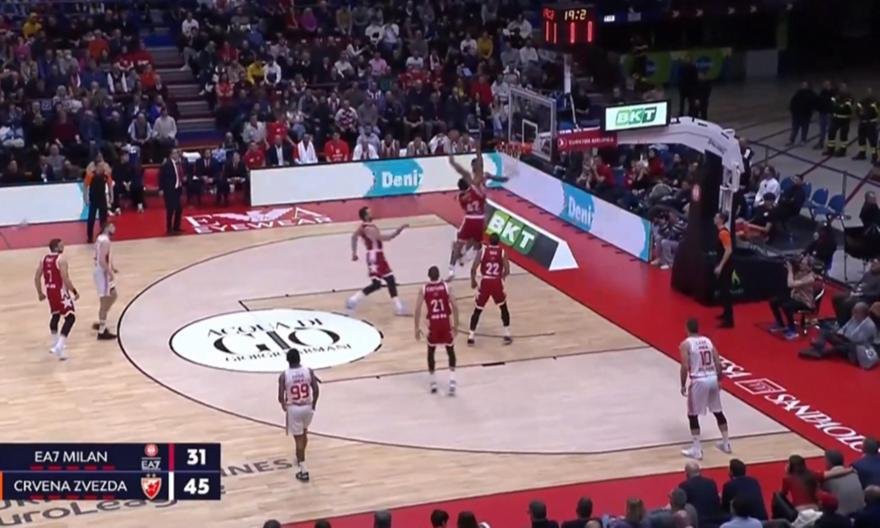 Ο 29χρονος Αμερικανός σέντερ του Ερυθρού Αστέρα πάτησε γερά και κάρφωσε εμφατικά την μπάλα, στο καλάθι της Αρμάνι Μιλάνο, κάνοντας πόστερ τον Κάιλ Χάινς.