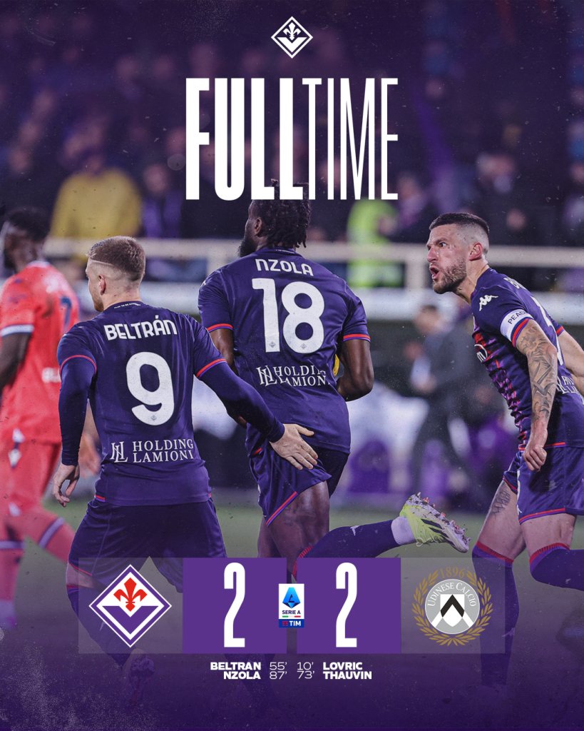 Στο 2-2 κόλλησαν Φιορεντίνα και Ουντινέζε με τον ένα βαθμό να εξυπηρετεί περισσότερο τους «βιόλα» που βρέθηκαν ξανά στην 4η θέση.
