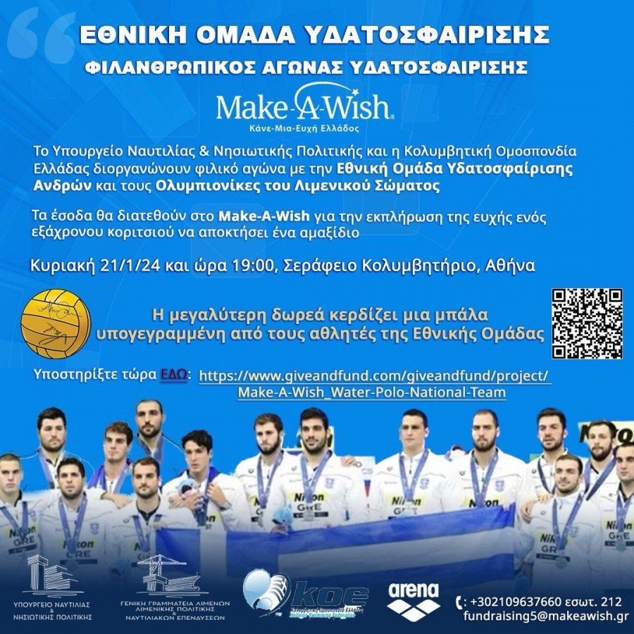 Ένας φιλικός αγώνας πόλο με φιλανθρωπικό χαρακτήρα θα διεξαχθεί στο Σεράφειο Κολυμβητήριο αυτή την Κυριακή (21/01), με ώρα έναρξης στις 19:00. Η Εθνική ομάδα πόλο των Ανδρών, θα αντιμετωπίσει την αντίστοιχη των Ολυμπιονικών του Λιμενικού Σώματος, με σκοπό το να διατεθούν τα χρήματα στο Make - A - Wish για να εκπληρωθεί η επιθυμία ενός 6χρονου κοριτσιού, να αποκτήσει αμαξίδιο.