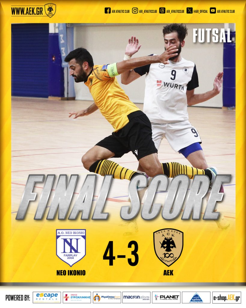 Σε ένα παιχνίδι που διήρκησε… τρεις ολόκληρες ημέρες, η ΑΕΚ ηττήθηκε τελικώς με 4-3 από το Νέο Ικόνιο εκτός έδρας για την 17η αγωνιστική της Futsal Super League. Ο αγώνας ξεκίνησε τη Δευτέρα, ωστόσο 9′ πριν το φινάλε και με το σκορ στο 3-2 υπέρ των γηπεδούχων, και ενώ η ΑΕΚ πίεζε για την ισοφάριση, το γήπεδο γέμισε νερά. Εδώ και μήνες γίνονται αναφορές για την ακαταλληλότητα του γηπέδου, ενώ εξαρχής υπήρχαν σοβαρά προβλήματα στο παρκέ.