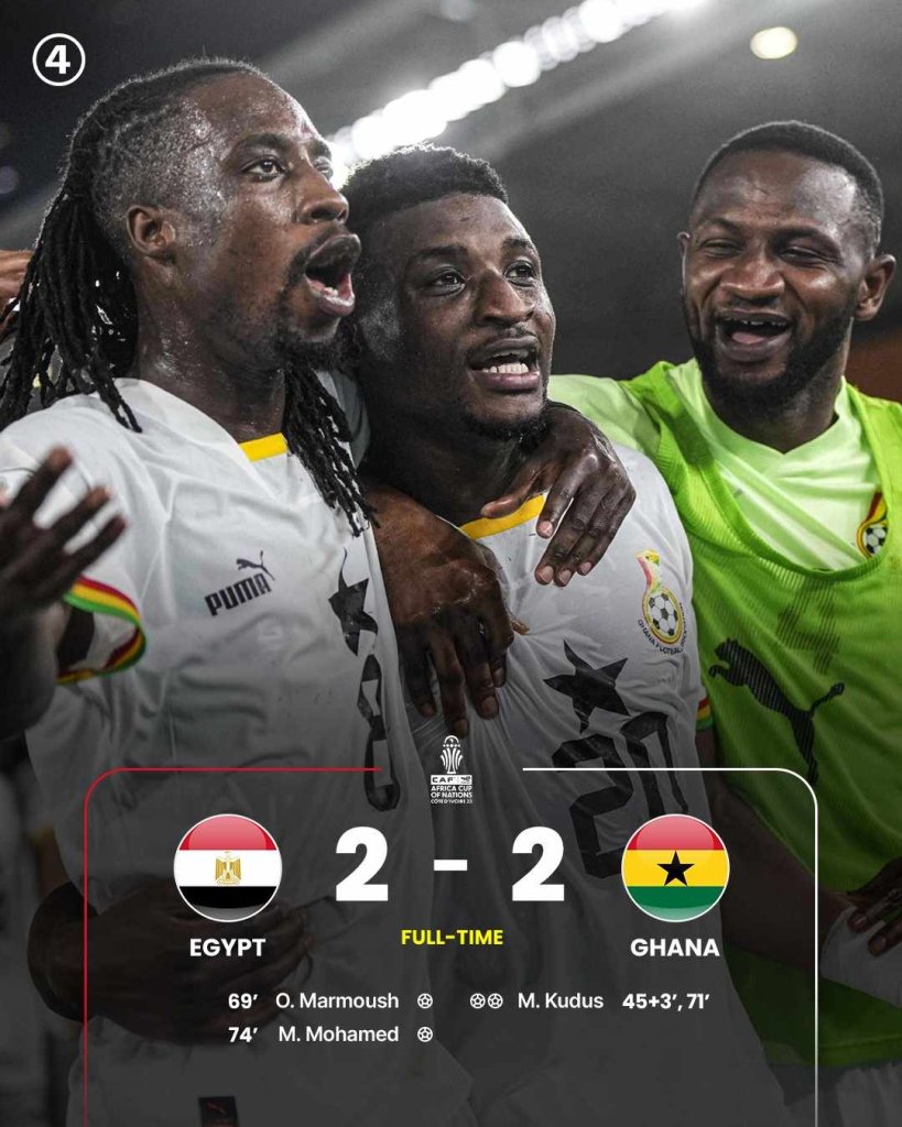 Οι Αιγύπτιοι είδαν τον αστέρα και αρχηγό τους Μοχάμεντ Σαλάχ να αποχωρεί στο 38’ με τραυματισμό. Στις καθυστερήσεις του πρώτου ημιχρόνου, η Γκάνα προηγήθηκε χάρη σε γκολ του Κούντους, στην πρώτη του αναμέτρηση στο Κύπελλο εθνών Αφρικής. Στο 69’ ο Μαρμούς ισοφάρισε σε 1-1 για τους Αιγύπτιους, αλλά η χαρά δε κράτησε πολύ καθώς 2’ μετά ξανά ο Κούντους, έδωσε εκ νέου κεφάλι στο σκορ 2-1 στην Γκάνα. Στο 74’ η Αίγυπτος ισοφάρισε ξανά με γκολ του Μοχάμεντ για το 2-2.