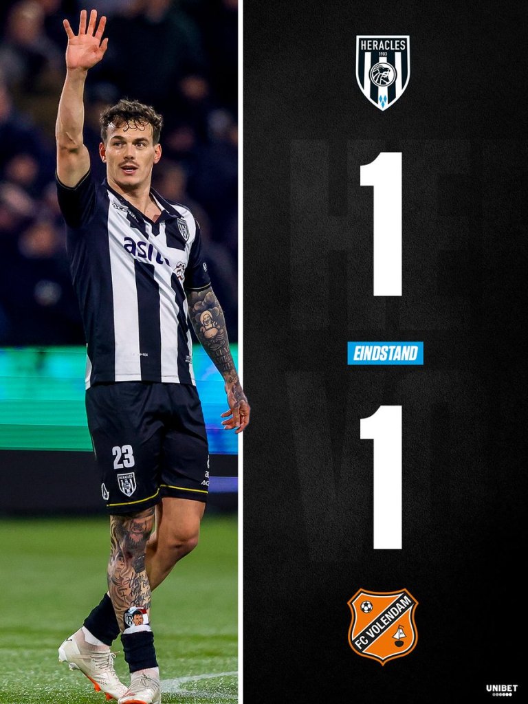 Ισόπαλες 1-1 αναδείχθηκαν Χέρακλες και Φόλενταμ με την ομάδα του Άλμελο να βρίσκεται στο +5 από τη θέση των μπαράζ και τους φιλοξενούμενους να παραμένουν στον πάτο της βαθμολογίας.