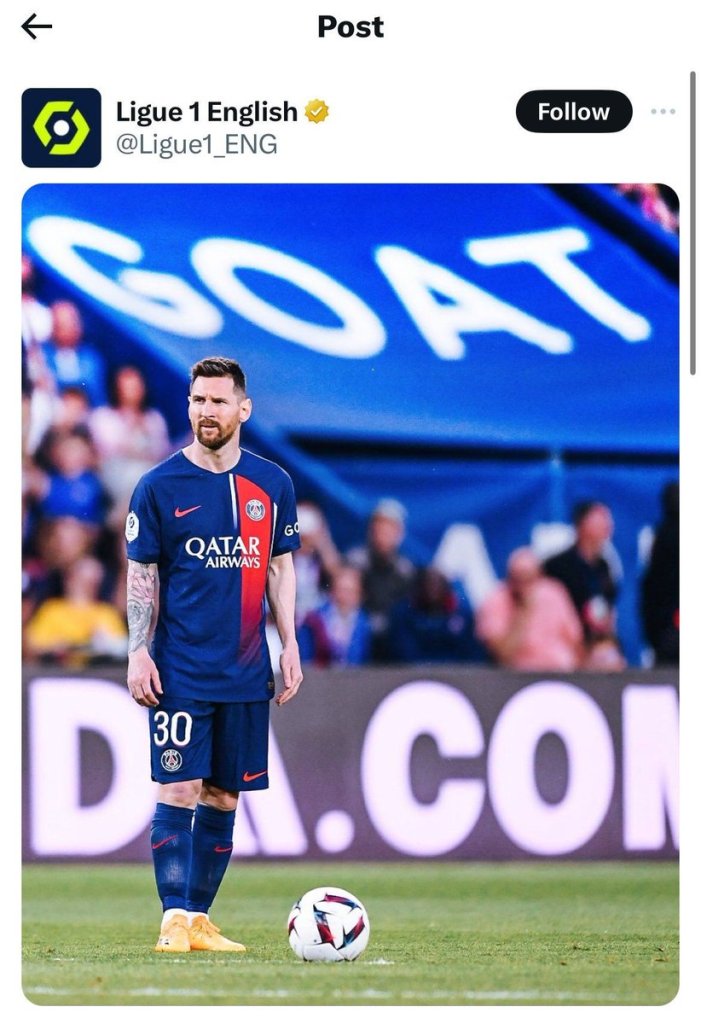Συγκεκριμένα, τα social media της Ligue 1 ανάρτησαν μια φωτογραφία του Αργεντινού παγκόσμιου πρωταθλητή με τη φανέλα της Παρί Σεν Ζερμέν, έχοντας από πίσω του τη διαφημιστική ταμπέλα με τη λέξη GOAT, ως ο κορυφαίος παίκτης όλων των εποχών.