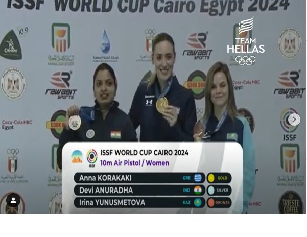 Λίγες ημέρες μετά την πρώτη θέση στο αεροβόλο πιστόλι 10μ., στο γκραν πρι στο Ρούσε της Σλοβενίας, η Άννα Κορακάκη κατέκτησε, την Παρασκευή, το χρυσό μετάλλιο στο αεροβόλο πιστόλι 10μ. και στο Παγκόσμιο Κύπελλο που διεξάγεται στο Κάιρο.