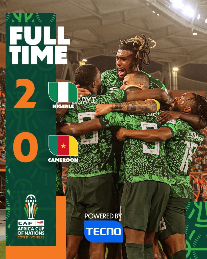 Η Νιγηρία κέρδισε με 2-0 το Καμερούν και πέρασε στα προημιτελικά. Έμειναν εκτός οι καμερουνέζοι κι έτσι ο Αρόλντ Μουκουντί επιστρέφει άμεσα στις υποχρεώσεις της ΑΕΚ. Ο Μουκουντί έμεινε στον πάγκο.