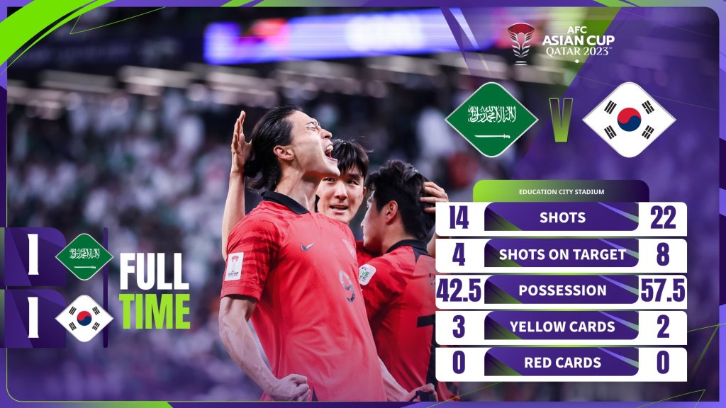 Το σκορ άνοιξε για τη Σ.Αραβία στο 46ο λεπτό ο Ραντίφ με κοντινό πλασέ αλλά στο 90+9’ ο Τσο Γκουέ Σουνγκ ισοφάρισε σε 1-1 με κεφαλιά κι έστειλε το ματς στην παράταση. Εκεί δεν υπήρξε γκολ και από εκεί πήγαμε στα πέναλτι. Εκεί οι Κανό, Σον, Αμπντουλχαμίντ και Γιουνγκ Γκουόν ευστόχησαν για το 2-2 και στη συνέχεια ο Γου απέκρουσε το πέναλτι του Αλ Νάτζι. Ο Γκουέ Σουνγκ έγραψε το 2-3 και ο Γου είπε όχι και στον Γκαρίμπ. Ο Χι Τσαν έκανε το 2-4 κι έστειλε την ομάδα του στα προημιτελικά.