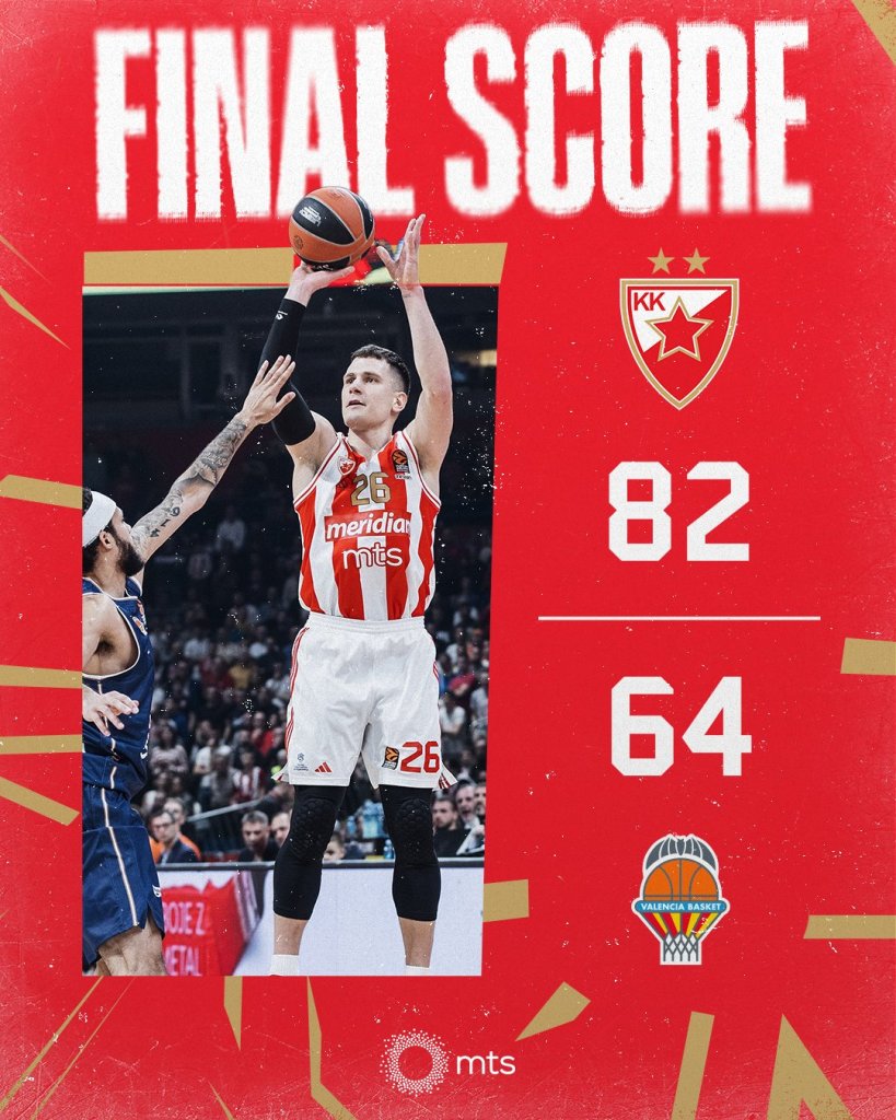 Μεγάλη νίκη για τον Ερυθρό Αστέρα στο Βελιγράδι κόντρα στη Βαλένθια, με την ομάδα του Γιάννη Σφαιρόπουλου να παίρνει τη νίκη με σκορ 82-64 χάρη σε απίστευτη εμφάνιση του Νεμάνια Νέντοβιτς, ο οποίος τελείωσε το ματς με 27 πόντους. Έτσι, οι Σέρβοι ανέβηκαν στο 10-14 και παραμένουν στο... κόλπο για την 10άδα και το play in.