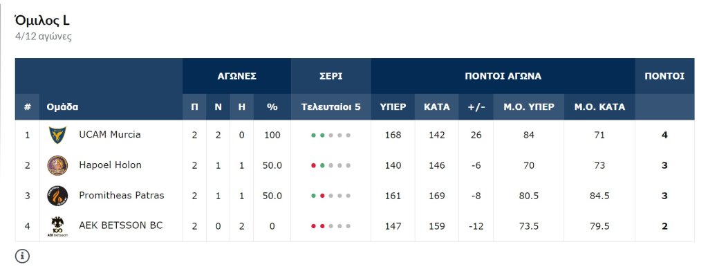 Η ήττα της ΑΕΚ από τη Χολόν και η νίκη της Μούρθια επί του Προμηθέα την έφερε στην τελευταία θέση του ομίλου μετά από δύο αγωνιστικές.