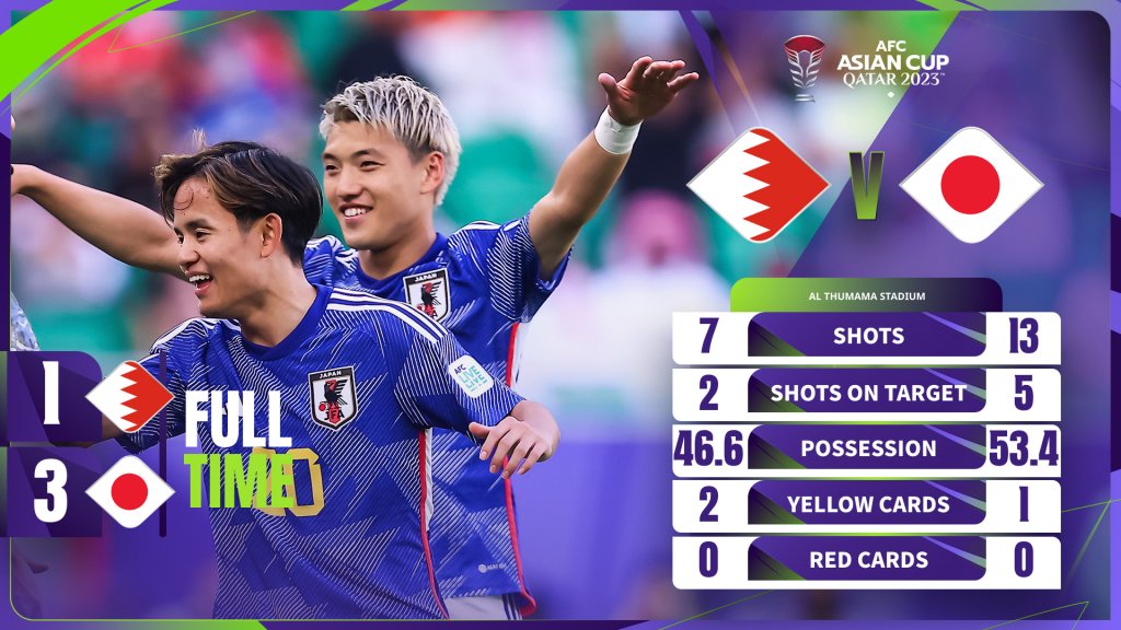 Η Ιαπωνία άνοιξε το σκορ στο 32ο λεπτό με τον Ντόαν και στο 49’ ο Κούμπο έγραψε το 0-2. Το Μπαχρέιν μείωσε με το αυτογκόλ του Σουζούκι στο 64ο λεπτό αλλά στο 72’ ο Ουέντα έκανε το 1-3.