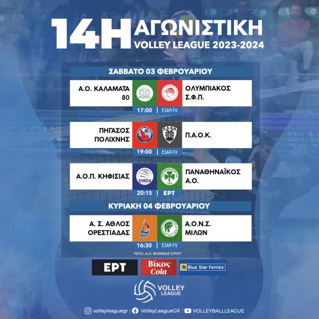 Ανακοινώθηκε επίσημα, το πλήρες πρόγραμμα της 14ης αγωνιστικής της Volley League Ανδρών, δηλαδή οι μέρες και οι ώρες διεξαγωγής των παιχνιδιών, αλλά και οι διαιτητές που θα «σφυρίξουν». Αναλυτικά: «To πρόγραμμα, οι διαιτητές και η TV, της 14ης αγωνιστικής στο πρωτάθλημα Volley League 2023-24: