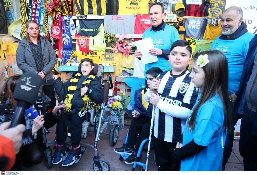 Η μικρή Μάγια και τρία παιδιά με αναπηρία ο Γιάννης, o Λέανδρος και ο Σπύρος, φορώντας φανέλες και κασκόλ των αγαπημένων τους ομάδων, του Άρη, του ΠΑΟΚ και της ΑΕΚ, αντίστοιχα, φώναξαν "Άλκη ζεις".