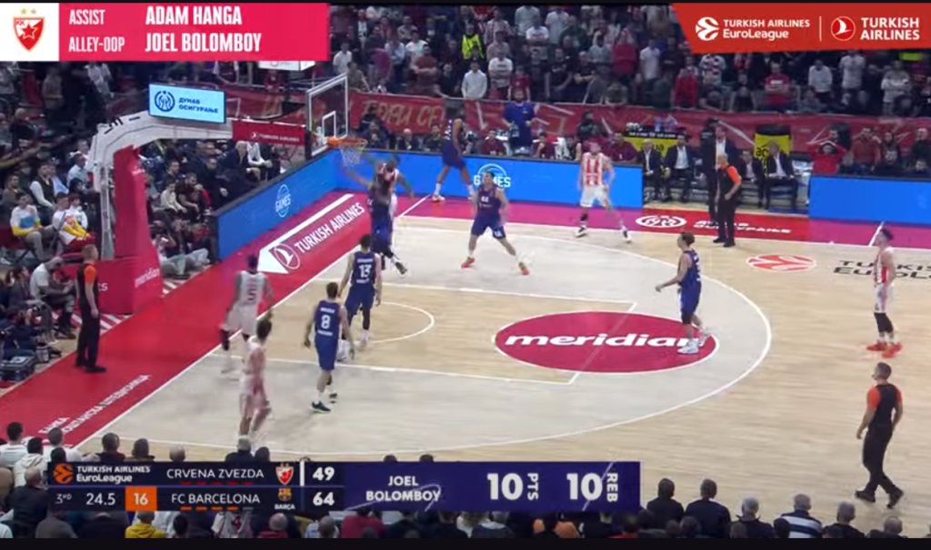 Με απίθανο άλμα, ο Τζόελ Μπολομπόι του Ερυθρού Αστέρα προσέφερε ένα θεαματικό άλει ουπ κάρφωμα, στο παιχνίδι με την Μπαρτσελόνα και η φάση αυτή βρίσκεται στην κορυφή του Top με τις δέκα κορυφαίες στιγμές, από τα παιχνίδια της 25ης αγωνιστικής στη Euroleague.