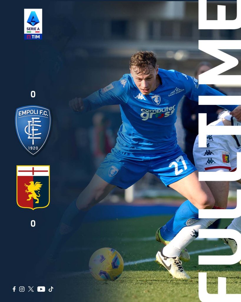 Ισόπαλες χωρίς σκορ αναδείχθηκαν Έμπολι και Τζένοα, με την πρώτη να παραμένει στη ζώνη του υποβιβασμού και τους Γενοβέζους να βρίσκονται αρκετά μακριά από αυτή.