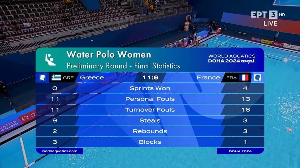 Με την Ελευθερία Πλευρίτου να πετυχαίνει τρία γκολ, η Εθνική πόλο Γυναικών επικράτησε 11-6 της Γαλλίας, στο πρώτο της παιχνίδι για το Παγκόσμιο Πρωτάθλημα Υγρού Στίβου. Οι παίκτριες της Αλεξίας Καμμένου κυριάρχησαν των Γαλλίδων και η ελληνική ομάδα, λίγες ημέρες αφότου εξασφάλισε την πρόκριση στους Ολυμπιακούς Αγώνες του Παρισιού, ξεκίνησε νικηφόρα τις υποχρεώσεις της στη Ντόχα.