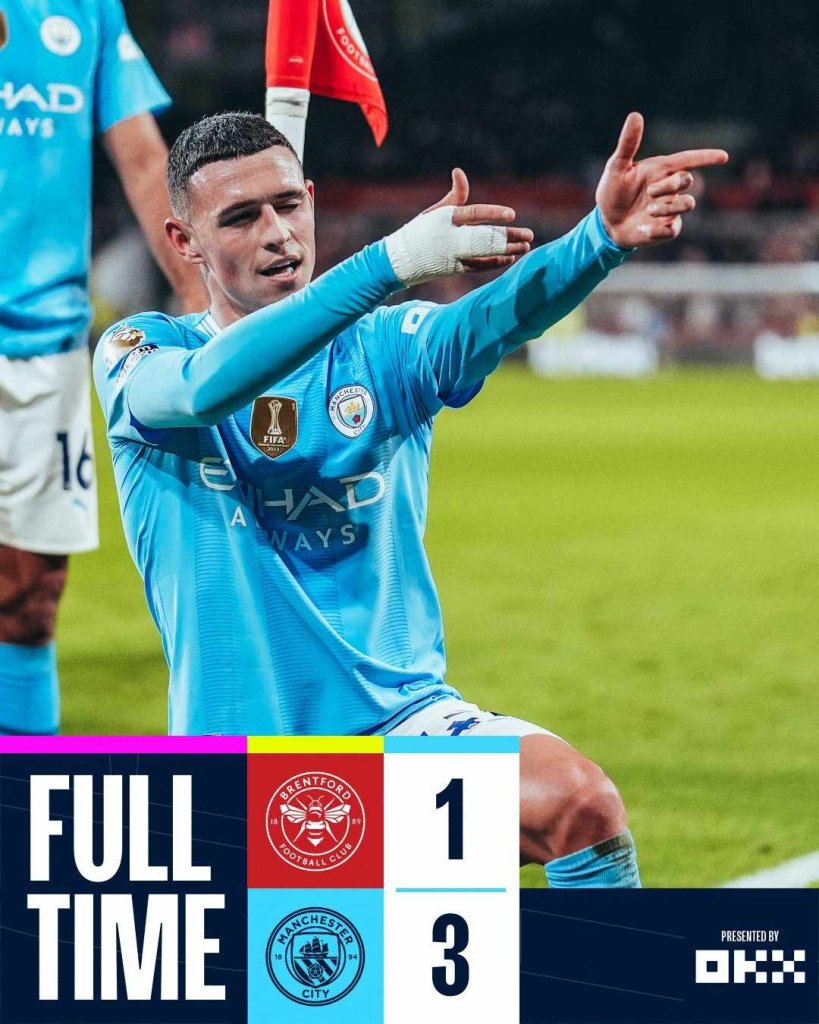 Μεγάλη νίκη με ανατροπή πέτυχε η Σίτι στην έδρα της Μπρέντφορντ με 3-1 και ανέβηκε στην 2η θέση, έχοντας παιχνίδι λιγότερο απο την πρωτοπόρο Λίβερπουλ.