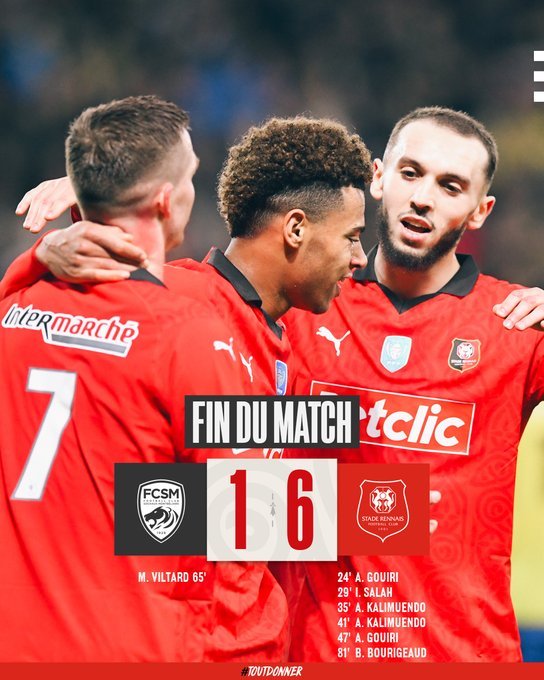 Την πρόκριση της για τα προημιτελικά του Coupe de France πανηγύρισε η Ρεν, καθώς επικράτησε 6-1 της Σοσό. Από δύο γκολ Γκουιρί και Καλιμουέντο.
