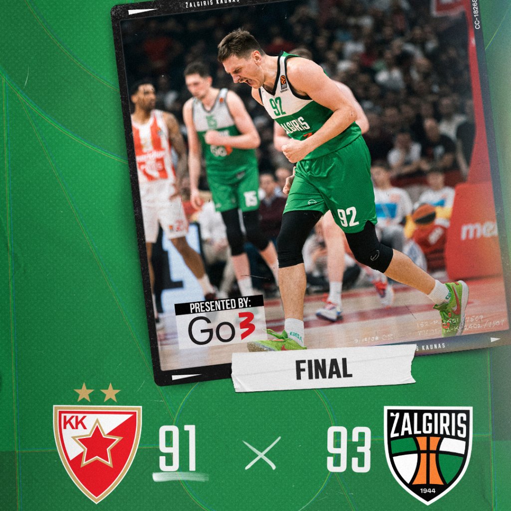 Η Ζαλκγίρις έφυγε με ένα σπουδαίο διπλό από το Βελιγράδι επικρατώντας του Ερυθρού Αστέρα με 93-91 σε παιχνίδι... θρίλερ. Εκπληκτική εμφάνιση από τον Κίναν Έβανς με 25 πόντους και 5/10 τρίποντα, ακόμα μοιράζει πάσες ο φοβερός Ντο Σάντος (21π. 14ασ.).