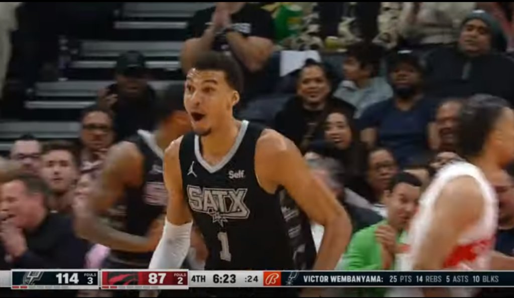 Στο Τορόντο, ο Βίκτορ Γουεμπανιαμά, Νο.1 των NBA Drafts 2023, έκανε ρεκόρ καριέρας στις τάπες, 10 τον αριθμό, και οι Σαν Αντόνιο Σπερς νίκησαν 122-99 τους Ράπτορς. Από το ξεκίνημα του αγώνα, ο Γάλλος φόργουορντ έδειξε τις διαθέσεις του, σε άμυνα και επίθεση, με τους Σπερς να προηγούνται 0-10 και, στο τέλος της πρώτης περιόδου, να είναι μπροστά με 28-34. Στο πρώτο 12λεπτο, ο ρούκι Γουεμπανιαμά είχε 9 πόντους, 4 ριμπάουντ, 3 τάπες και, στη δεύτερη περίοδο, πρόσθεσε άλλους 10 πόντους στο ενεργητικό του. Την ίδια στιγμή, ο συμπαίκτης του, ο Ντέβιν Βάσελ, έβαλε 13 πόντους και, χάρη σε αυτούς τους δυο, οι Σπερς έκλεισαν το ημίχρονο, προηγούμενοι 50-67. Στη τρίτη περίοδο, ο Γουεμπανιαμά μοίρασε έξι τάπες και η ομάδα του Πόποβιτς βρέθηκε στο +28, 75-103, ενόψει τέταρτης περιόδου, έχοντας, ουσιαστικά, καθαρίσει το παιχνίδι.