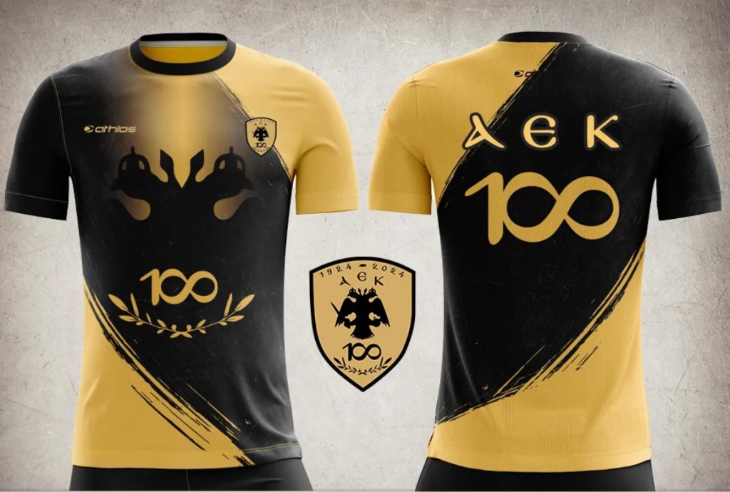 Εκτός της πορφυρής φανέλας, που προέρχεται από το χρώμα της Βυζαντινής Αυτοκρατορίας, η ΑΕΚ παρουσιάζει και την κιτρινόμαυρη εκδοχή της επετειακής φανέλας των 100 ετών.