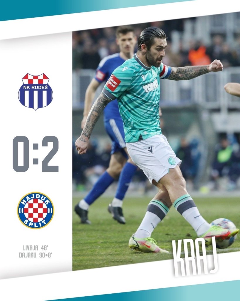 Ζωντανή στη μάχη του τίτλου έμεινε η Χάιντουκ η οποία πέρασε με 2-0 από την έδρα της Ρουντές και παρέμεινε στο -2 από την πρωτοπόρο Ριέκα. Ο Μάρκο Λιβάγια επέστρεψε μετά από τρεις εβδομάδες και ήταν εκείνος που πέτυχε και άνοιξε το σκορ στο 58ο λεπτό με κεφαλιά. Αυτό ήταν και το 8ο φετινό του γκολ αλλά και το πρώτο στο πρωτάθλημα μετά από τον Νοέμβριο. Το 2-0 έγραψε στις καθυστερήσεις ο Νταγιάκου.