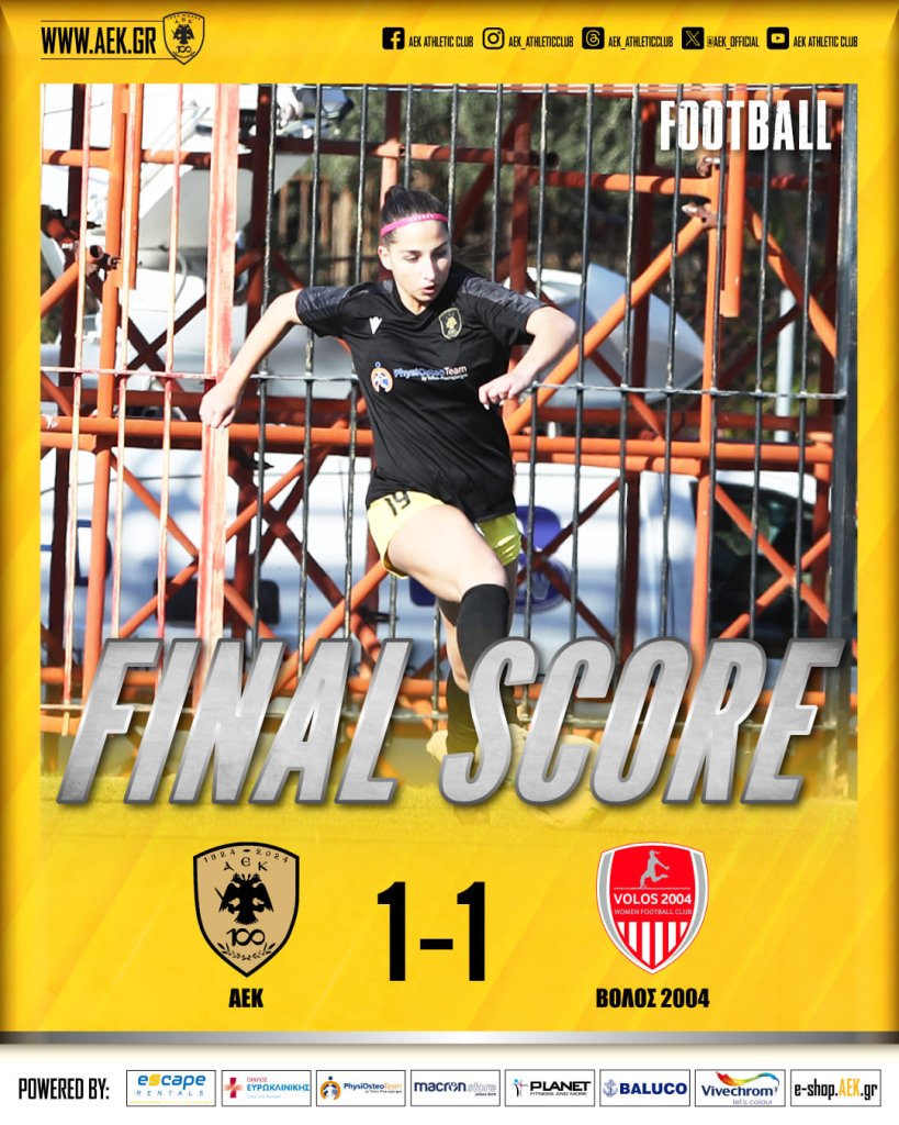 Μεγάλη ευκαιρία να ανέβει στην 4η θέση της βαθμολογίας απώλεσε η ΑΕΚ, καθώς αναδείχθηκε ισόπαλη 1-1 με το Βόλο στο Δ.Γ. Σουρμένων, στο πλαίσιο της 15ης αγωνιστικής της Women’s Football League. Η ομάδα του Νίκου Κωτσοβού, δεν κατάφερε να κατακτήσει το τρίποντο που θα της έδινε μεγάλη βαθμολογική και ψυχολογική ώθηση, καταφέρνοντας όμως και πάλι να μείνει αήττητη στις καθυστερήσεις, μιας και ισοφάρισε στο 92′.