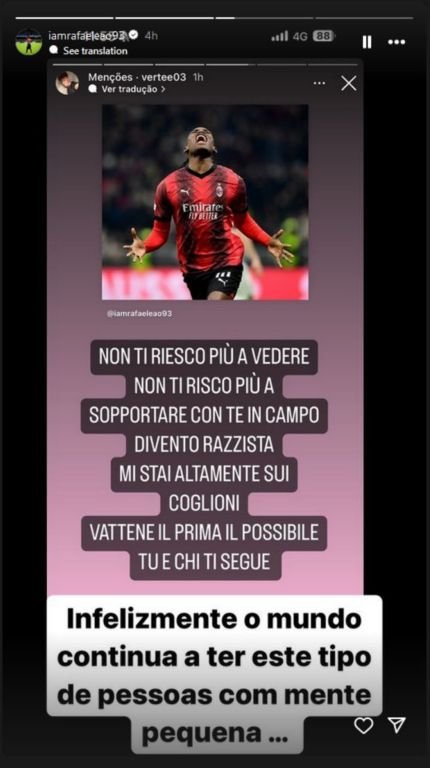 Συγκεκριμένα, ένας φίλος των «ροσονέρι» έγραψε για τον Πορτογάλο «δεν μπορώ πια να σε βλέπω, δεν σε αντέχω άλλο. Με εσένα στον αγωνιστικό χώρο, γίνομαι ρατσιστής. Πραγματικά με κάνεις έξαλλο, φύγε όσο πιο γρήγορα γίνεται, εσύ και όσοι σε ακολουθούν», ένα αισχρό δηλαδή ρατσιστικό σχόλιο.