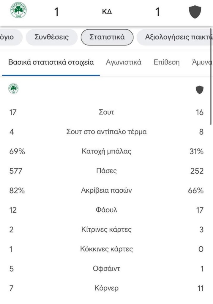 Η Κηφισιά πήρε την ισοπαλία από τον Παναθηναϊκό στη Λεωφόρο ή το αντίθετο; Με βάση την εικόνα του αγώνα και ειδικά τις απίθανες ευκαιρίες που έχασαν οι παίκτες του Μπράτσου στα τελευταία λεπτά, μάλλον το αντίθετο. Τα στατικά του αγώνα δείχνουν ξεκάθαρα πως η Κηφισιά αδίκησε τον εαυτό της στη Λεωφόρο και θα μπορούσε να πάρει τη νίκη. Η Κηφισιά έκανε 16 τελικές μέσα στη Λεωφόρο εκ των οποίων οι 8 στην εστία! Ο Παναθηναϊκός έκανε μεν 17 τελικές, αλλά μόλις τέσσερις εξ αυτών πήγαν στην εστία. Επιπλέον η Κηφισιά είχε και ένα δοκάρι, όπως και περισσότερα κόρνερ! 11 έναντι 7 του ΠΑΟ!