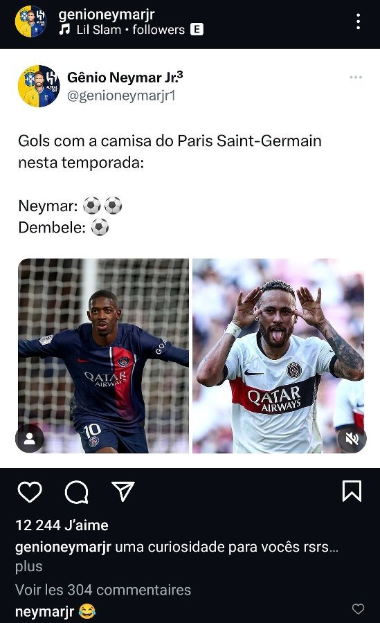 Σε ένα ποστάρισμα που αναφερόταν στα απογοητευτικά στατιστικά του Γάλλου επιθετικού, βρήκε αφορμή να στάξει το... φαρμάκι του και ο Νεϊμάρ, ο οποίος σχολίασε ειρωνικά τη σχετική ανάρτηση με emoji που γελάει.