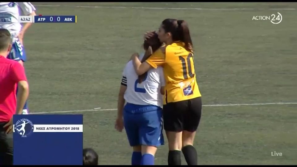Στο 44ο λεπτό της συνάντησης Νέου Ατρομήτου - ΑΕΚ η γηπεδούχος ομάδα έμεινε με 10 παίκτες, λόγω αποβολής, με δεύτερη κίτρινη κάρτα που δέχθηκε η Κριεζή. Οι παίκτριες της ΑΕΚ πήγαν πάνω της και παραρήγορησαν την αντίπαλό τους.