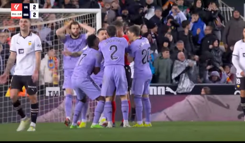 Επεισοδιακό ήταν το φινάλε στο "Μεστάγια", όπου Βαλένθια και Ρεάλ Μαδρίτης έμειναν στο 2-2, με τον Τζουντ Μπέλινγκχαμ να σκοράρει, στις καθυστερήσεις, αλλά, το γκολ να μην μετράει, διότι ο διαιτητής Μανθάνο είχε σφυρίξει τη λήξη. Πριν συμπληρωθούν τριάντα λεπτά αγώνα, η Βαλένθια είχε καταφέρει να σκοράρει δυο φορές και να προηγηθεί 2-0. Στις καθυστερήσεις του ημιχρόνου, ο Βινίσιους μείωσε, για τη Ρεάλ, και, στο 76ο λεπτό, ο Βραζιλιάνος ακραίος επιθετικός ισοφάρισε σε ένα γήπεδο, όπου, αρκετές φορές, έχει γίνει δέκτης ρατσιστικών συνθημάτων. Η αγωνία χτύπησε κόκκινο, με αποκορύφωμα τη φάση του 99ου λεπτού, όταν έπειτα από κόρνερ της Ρεάλ η μπάλα απομακρύνθηκε, ο Μπραχίμ Ντίαθ έβγαλε σέντρα από δεξιά και ο Τζουντ Μπέλινγκχαμ με κεφαλιά έστειλε την μπάλα στα δίχτυα. Οι παίκτες της Ρεάλ πανηγύρισαν μέχρι να δουν τον διαιτητή να τους ενημερώνει πως είχε σφυρίξει τη λήξη.