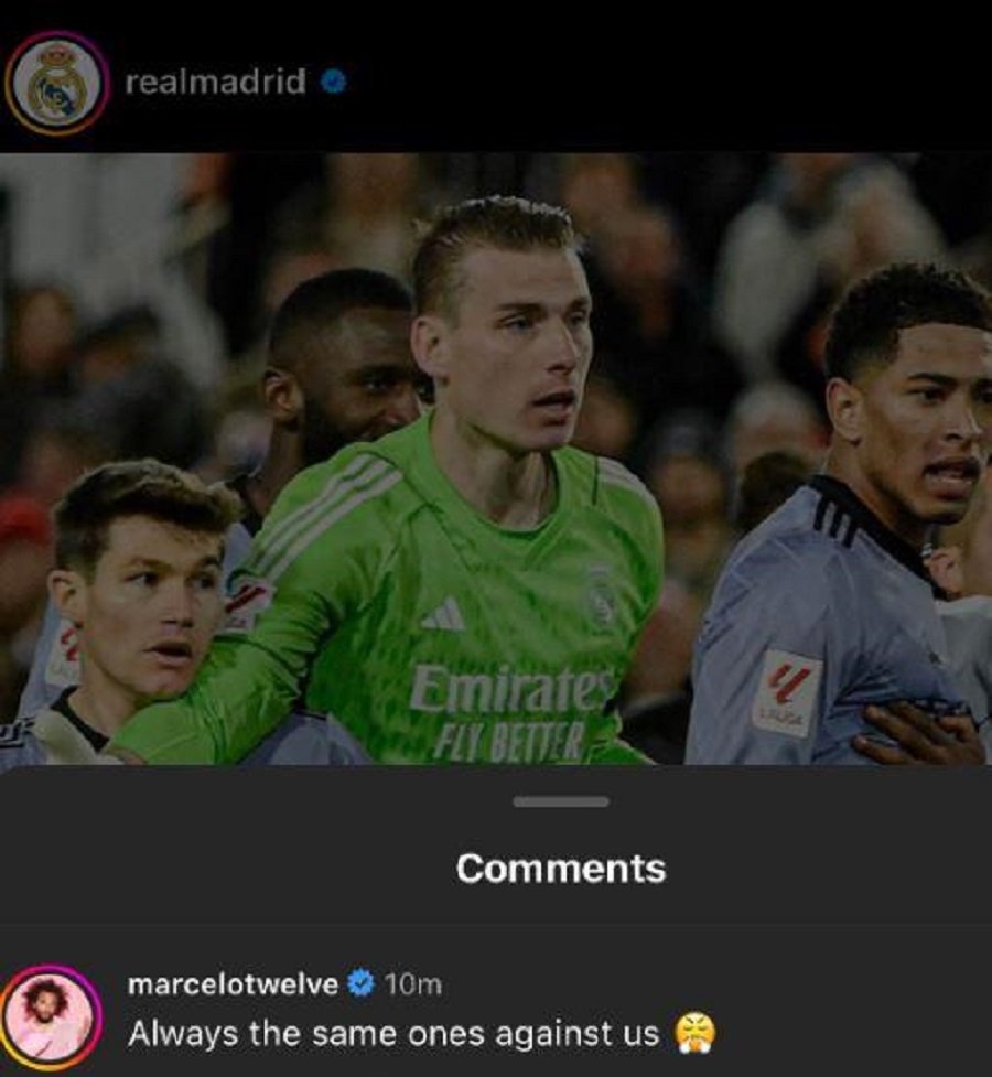 Όλα όσα έγιναν στο «Μεστάγια» δεν πέρασαν απαρατήρητα και στον Μαρσέλο ο οποίος μετά το τέλος του ματς, έσπευσε στο ποστάρισμα της Ρεάλ Μαδρίτης να σχολιάσει τις εξοργιστικές διαιτητικές αποφάσεις, γράφοντας: «Πάντα τα ίδια εναντίον μας».