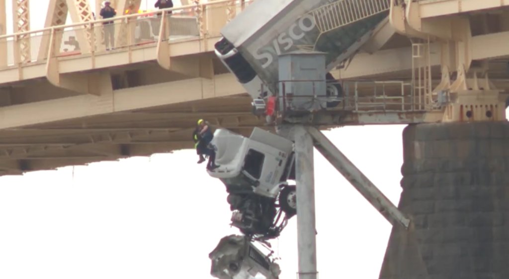 Όπως φαίνεται στο βίντεο, το φορτηγό κατέληξε να κρέμεται από την άκρη γέφυρας πάνω από τον ποταμό Οχάιο κοντά στο Λούισβιλ του Κεντάκι.