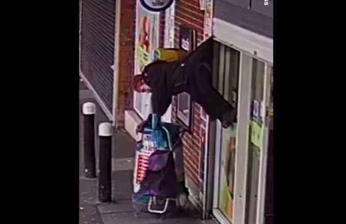 Μέσα σε λίγα λεπτά, ο καταστηματάρχης σπεύδει έξω και σπεύδει να ξεκρεμάσει την ηλικιωμένη, η οποία ευτυχώς δεν υπέστη κάποιον τραυματισμό.