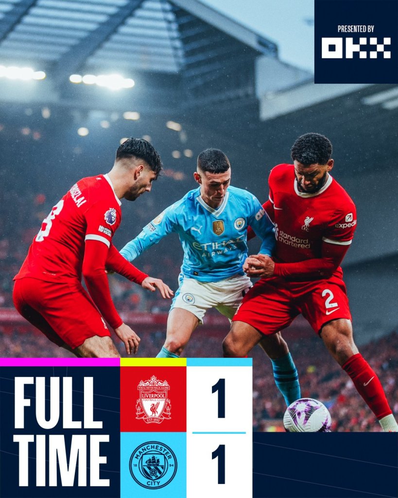 Μοιρασιά στο «Άνφιλντ» για Σίτι και Λίβερπουλ με κερδισμένη την Άρσεναλ! Η ομάδα του Κλοπ έμεινε στο 1-1 με τους «πολίτες» και απέκτησε συγκάτοικο την Άρσεναλ στην πρώτη θέση. Από την άλλη η Σίτι ακολουθεί στον ένα βαθμό και αναμένεται μάχη μέχρι τέλους. Φοβερός ρυθμός στο ματς με δύο δοκάρια, με πολλές φάσεις και μεγάλη ένταση.