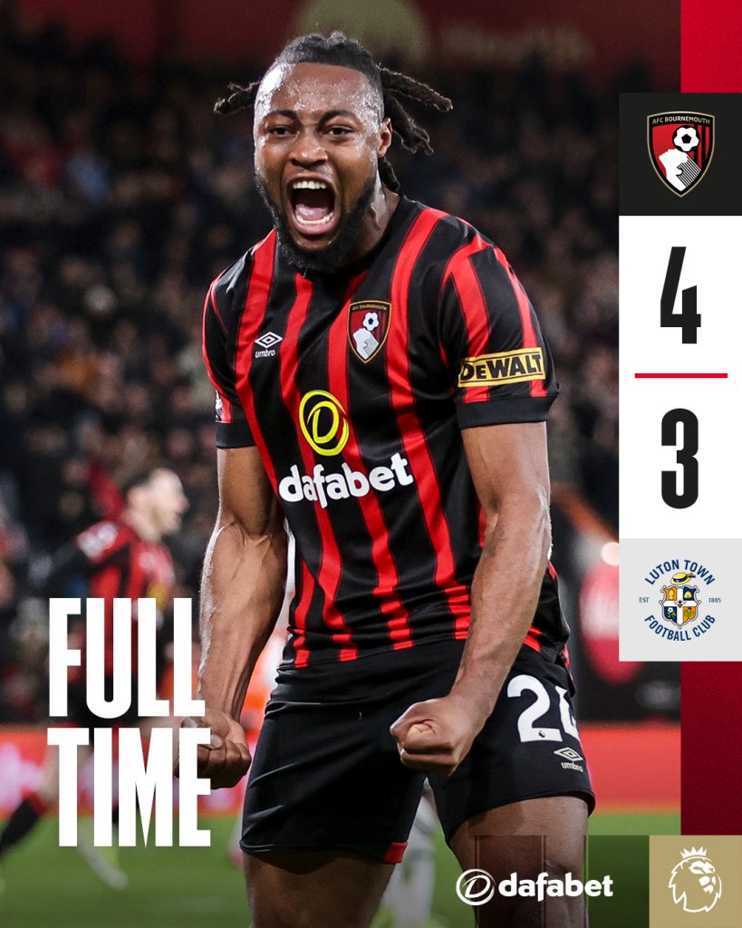 Μυθική ανατροπή για την Μπόρνμουθ, η οποία βρέθηκε να χάνει με 3-0 στο ημίχρονο από τη Λούτον κι όμως στο τέλος κέρδισε με 4-3. Αυτοκτονία για τη Λούτον που το Σάββατο υποδέχεται τη Νότιγχαμ σε τελικό παραμονής.