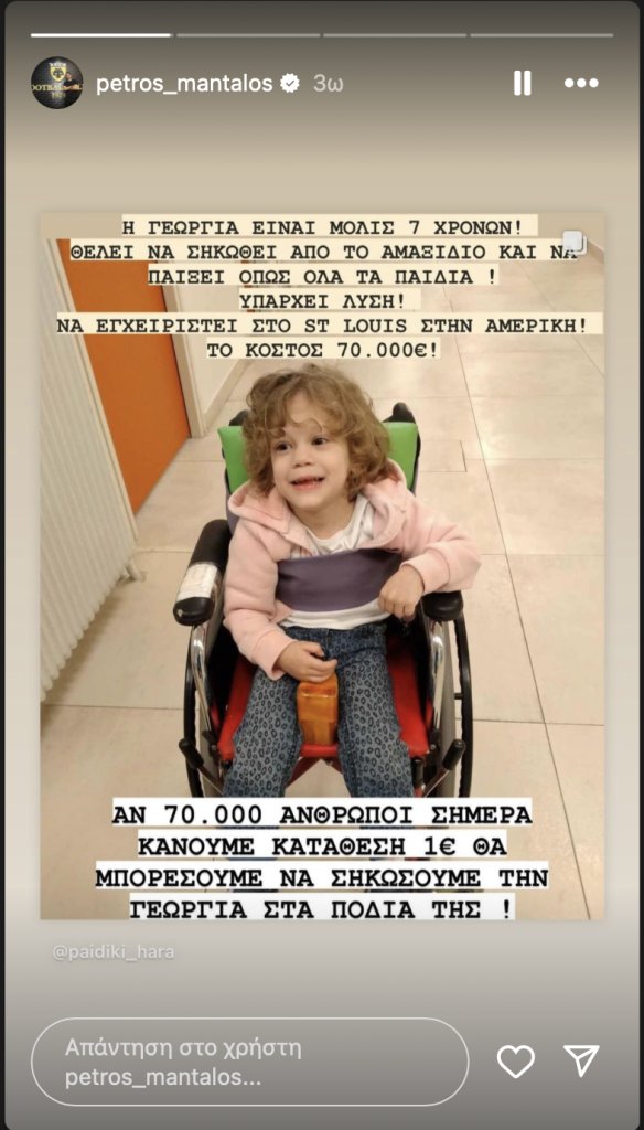 Ο Πέτρος Μάνταλος με ανάρτηση του στο instagram απευθύνει κάλεσμα ανθρωπιάς για τη στήριξη που χρειάζεται η μικρή Γεωργία που δίνει τον δικό της αγώνα ζωής. Δείτε την ανάρτηση: