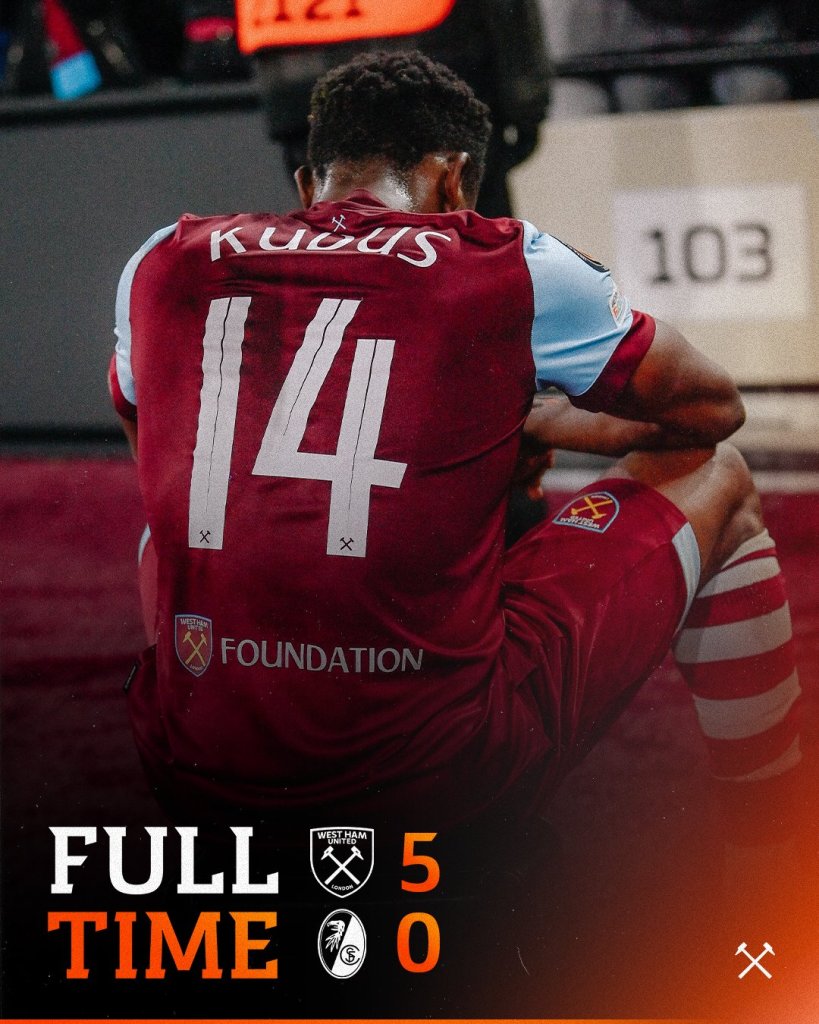 Σε παράσταση για ένα ρόλο μετέτρεψε τον επαναληπτικό με την Φράιμπουργκ, η Γουέστ Χαμ. Η ομάδα του Λονδίνου ήταν καταιγιστική και με δύο γκολ στο πρώτο και τρία στο δεύτερο ημίχρονο, διέλυσε με 5-0 τους Γερμανούς ανατρέποντας την ήττα με 1-0 στο πρώτο παιχνίδι.