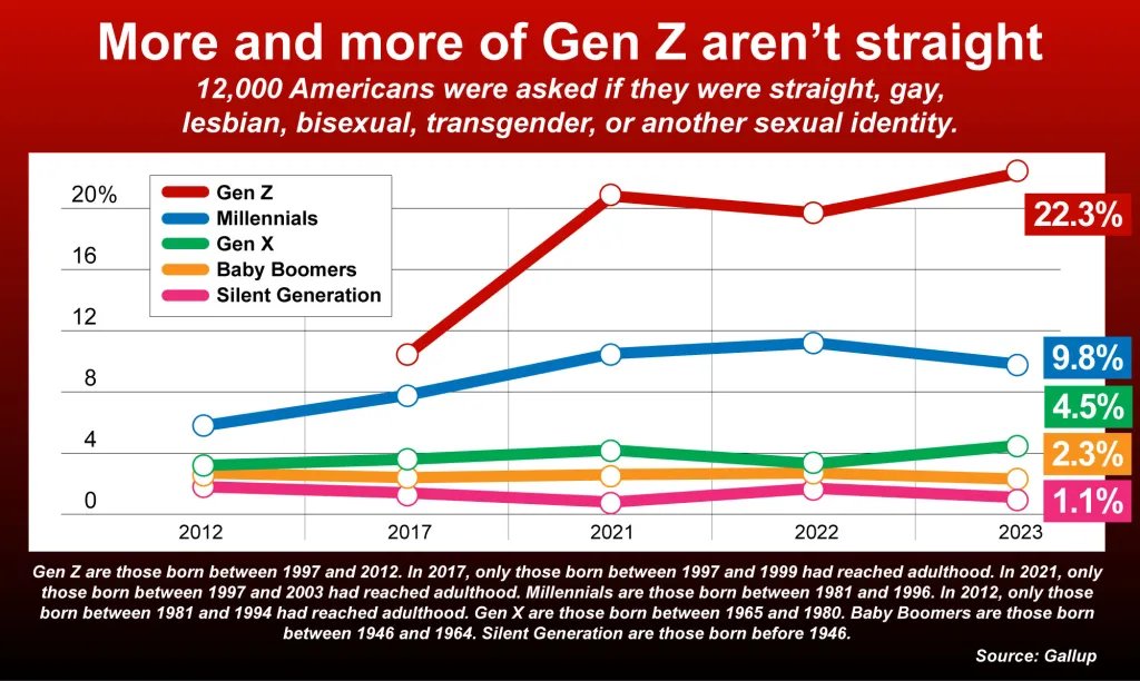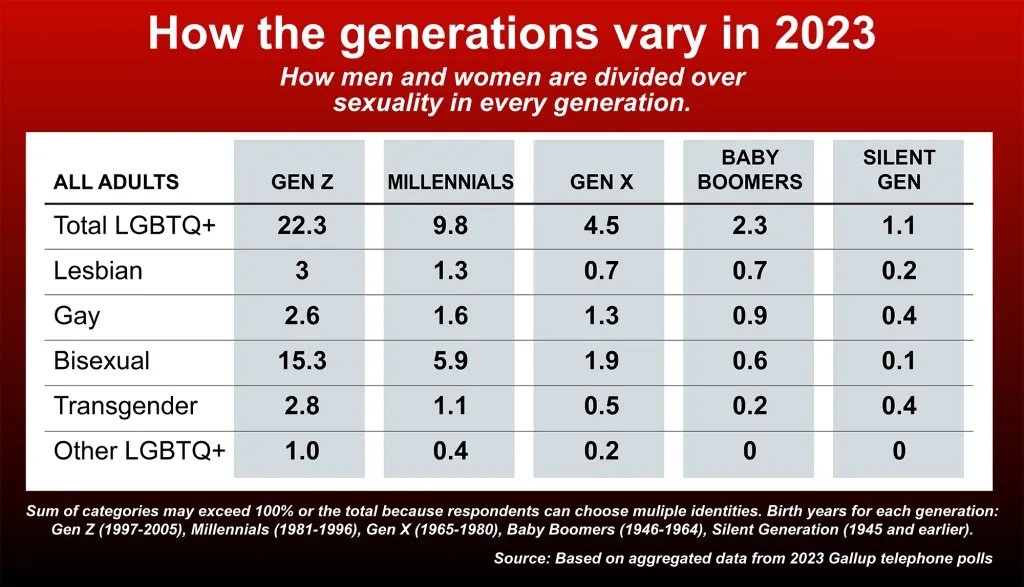 Σύμφωνα με την νέα έρευνα που έγινε από το ινστιτούτο Gallup με δείγμα 12.000 άτομα, το 22,3% των Αμερικανών που ανήκουν στη Generation Z δηλώνουν ότι είναι γκέι, λεσβίες, bisexoual, queer, τρανς ή «άλλο».