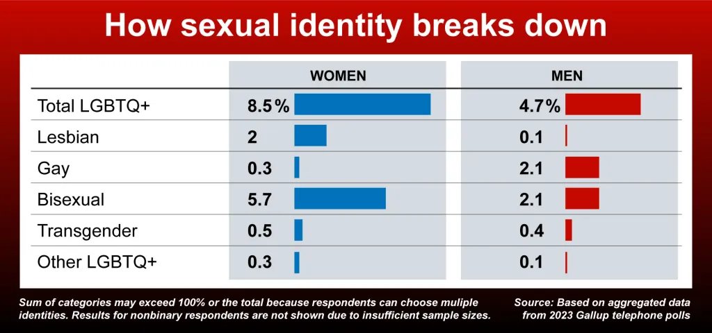 Όσον αφορά στις γυναίκες της Gen Z, το 28,5% δηλώνουν ότι δεν είναι straight. Επιπλέον το 20,7% δηλώνουν bisexual.