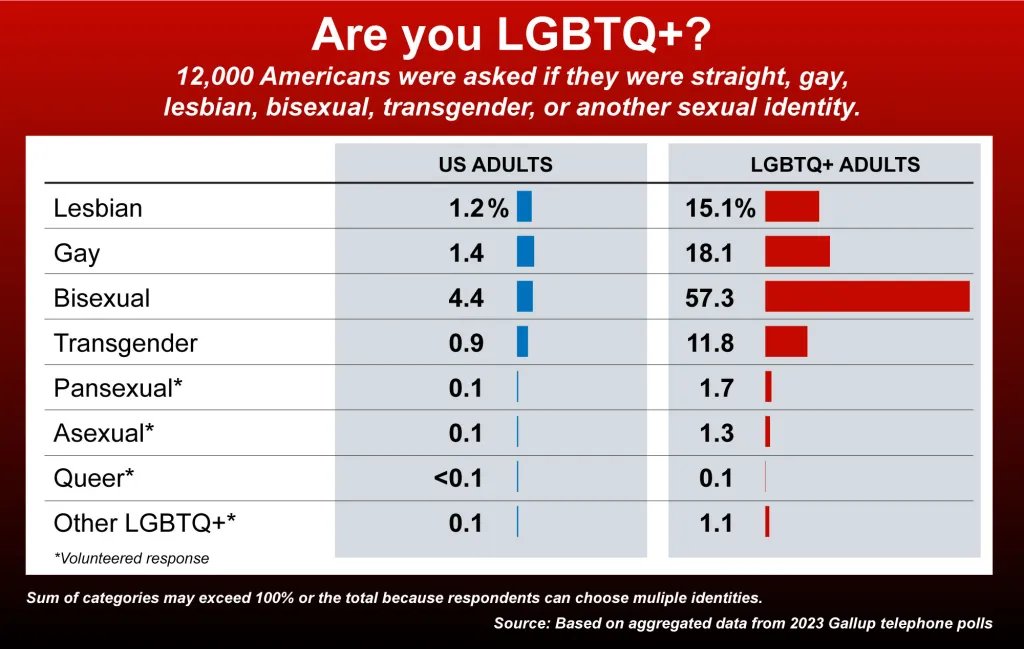 Η δημοσκόπηση αποκάλυψε επίσης ότι ο αριθμός των ΛΟΑΤΚΙ+ Αμερικανών έχει διπλασιαστεί την τελευταία δεκαετία, με το 7,6% των Αμερικανών ενηλίκων να αναγνωρίζονται ως ΛΟΑΤΚΙ+.