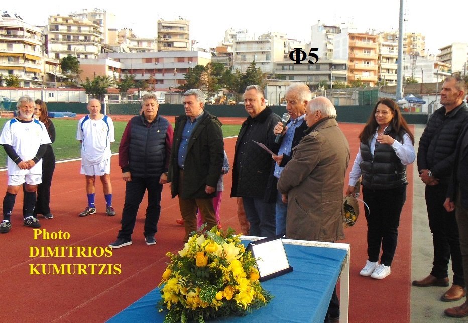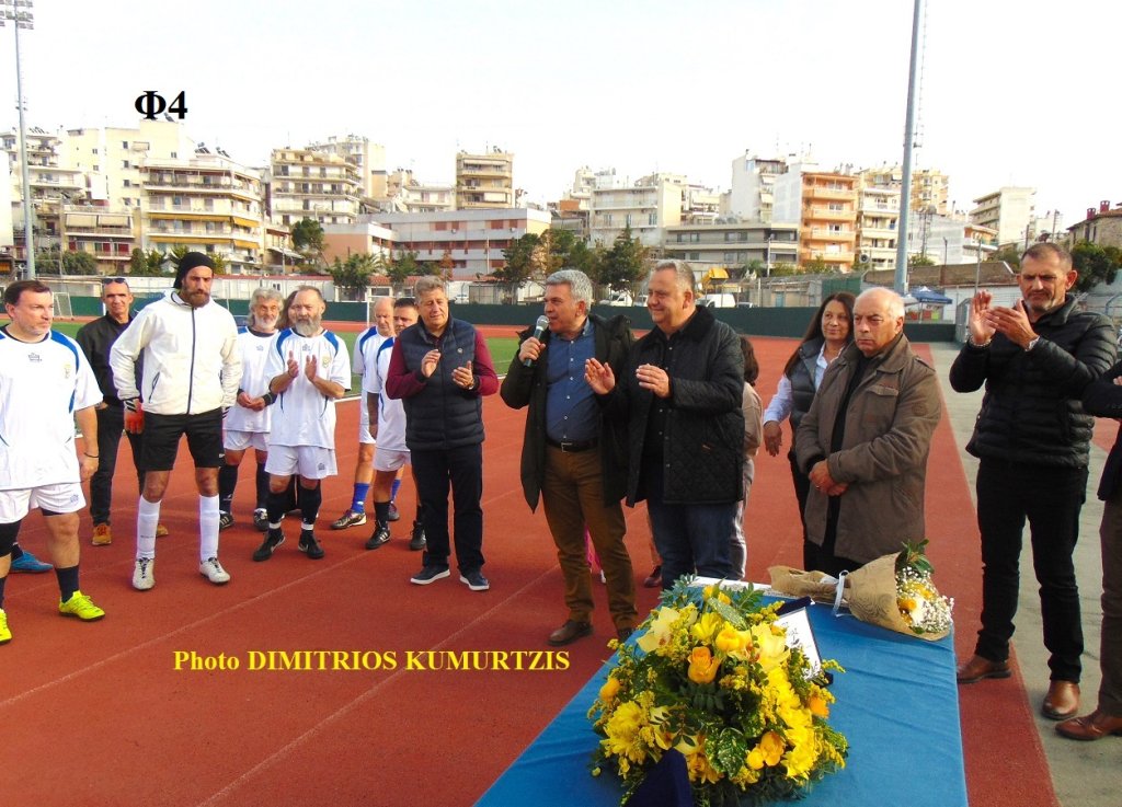 Φ3 Γιώργος Καραφέσκος, Γιώργος Ουσταμπασίδης, Κώστας Νικολαίδης και οι ποδοσφαιριστές των δύο ομάδων ακούνε τον Παναγιώτη Μανουρη, που έχει δίπλα του τον Δήμαρχο Νεας Φιλαδέλφειας