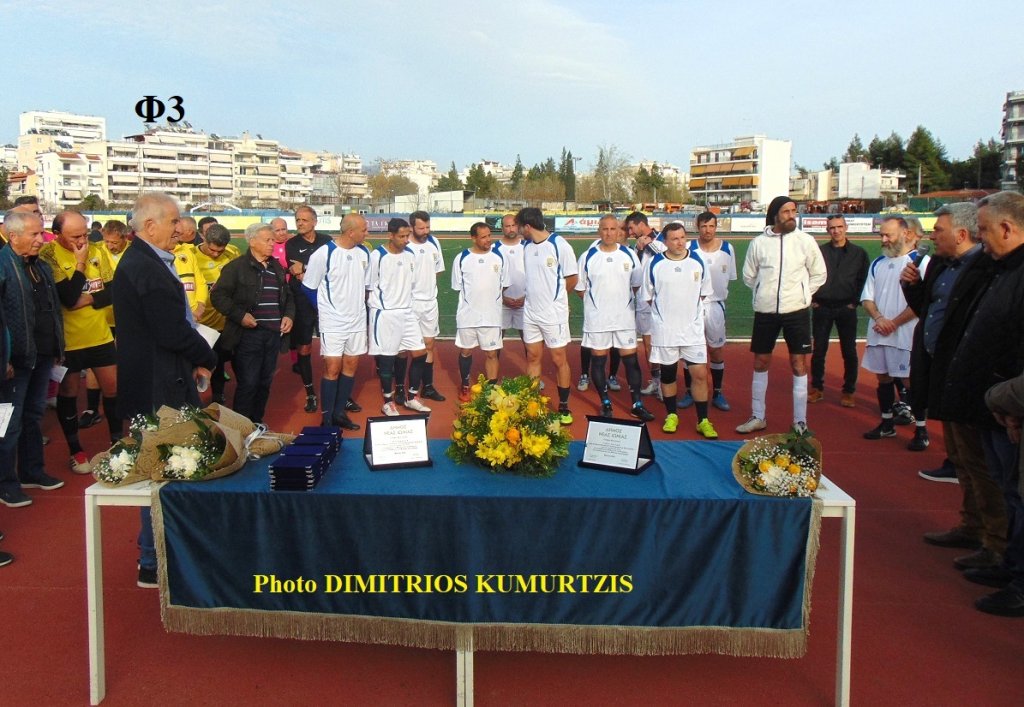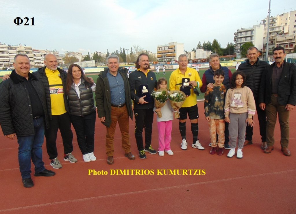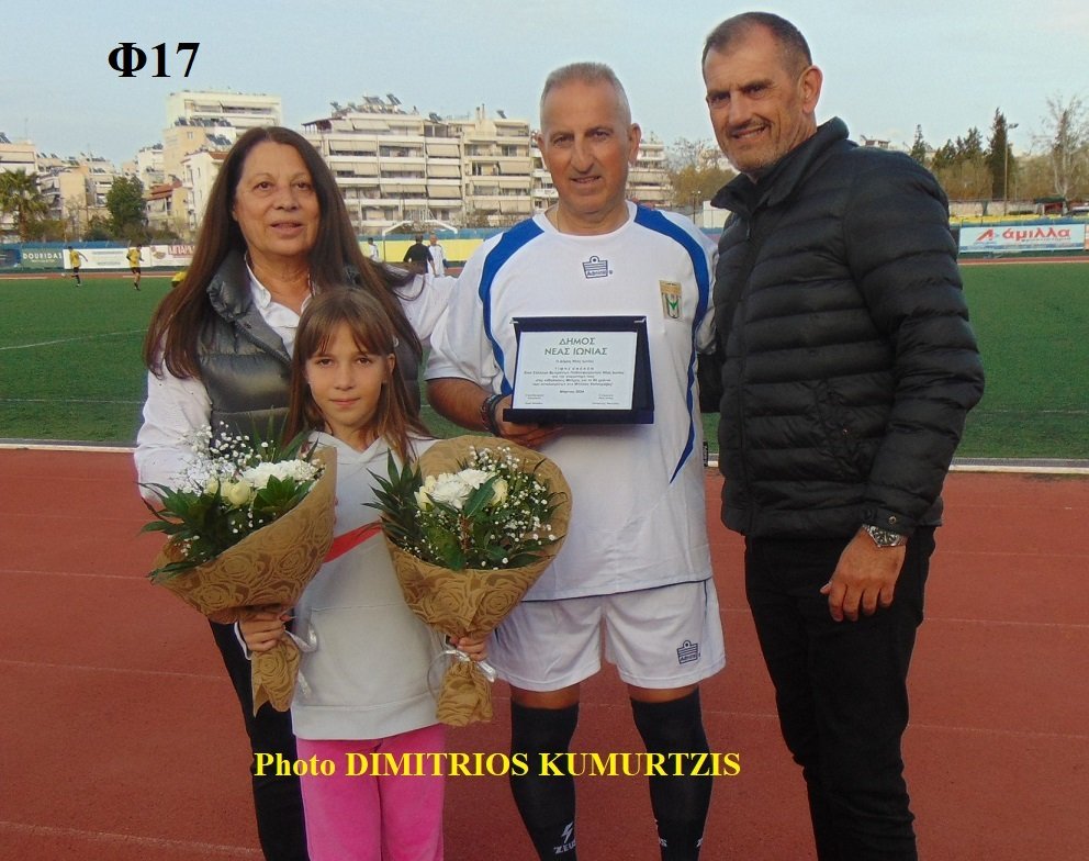 Φ17 Οι αντιδήμαρχοι αθλητισμού Σοφία Ναϊσίδου και βρεφονηπιακών και παιδικών σταθμών Σωτήρη Σκευοφύλακα, απένειμαν πλακέτα στον αρχηγό των γηπεδούχων Κώστα Ελευθεριάδη