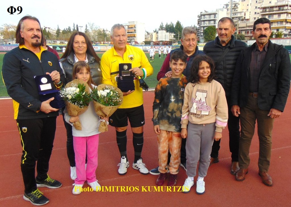 Φ9 Λυσσανδρος Γεωργαμλής και Γιώργος Νεστορίδης κρατάνε τις αναμνηστικές πλακέτες που έδωσαν στους βετεράνους της ΑΕΚ για τη συμμετοχή τους στον αγώνα η αντιδήμαρχος αθλητισμού Νέας Ιωνίας Σοφία Ναϊσίδου ο αντιδήμαρχος Σωτήρης Σκευοφύλακας και οι δημοτικοί σύμβουλοι Τ. Καρβουνιάρης-Β. Σπυλιοτόπουλος.