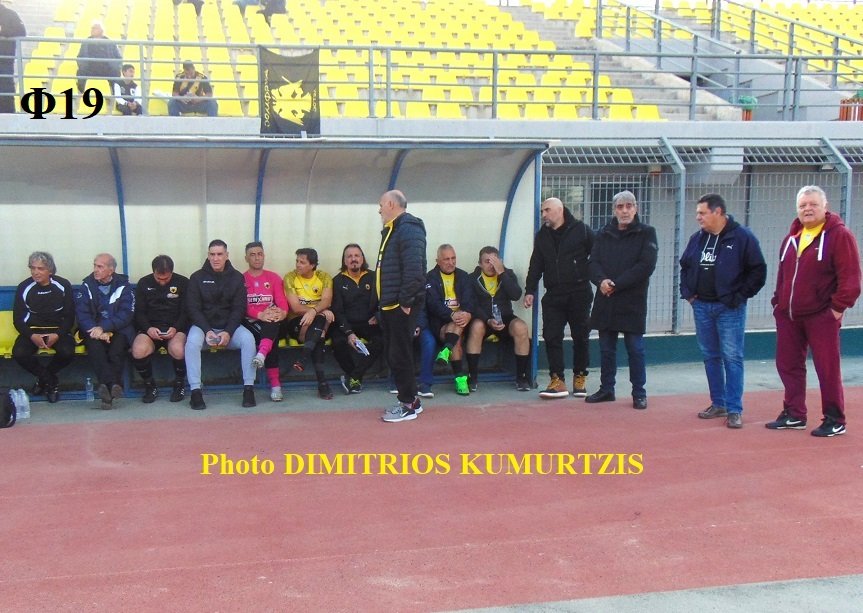 Φ19 Ο εκλέκτορας της ομάδος βετεράνων της ΑΕΚ Τάκης Καραγκιοζόπουλος, σχολιάζει τα δρώμενα του αγωνα με τους Ζωγράφο, Μ.Κώτη, Η.Κυριακίδη, Α.Θεοδωρόπουλο, Δ. Χιώτη, Κοπιτσή Γ. Νεστορίδη, Ι.Μαγγίνα και Σ. Πορφυρη που κάθονται στον πάγκο. Ορθιοι οι Σ. Μπούγλας, Σ. Σταματής, Χ. Ζαρωτιάδης και Π. Παπαθεοδωρου