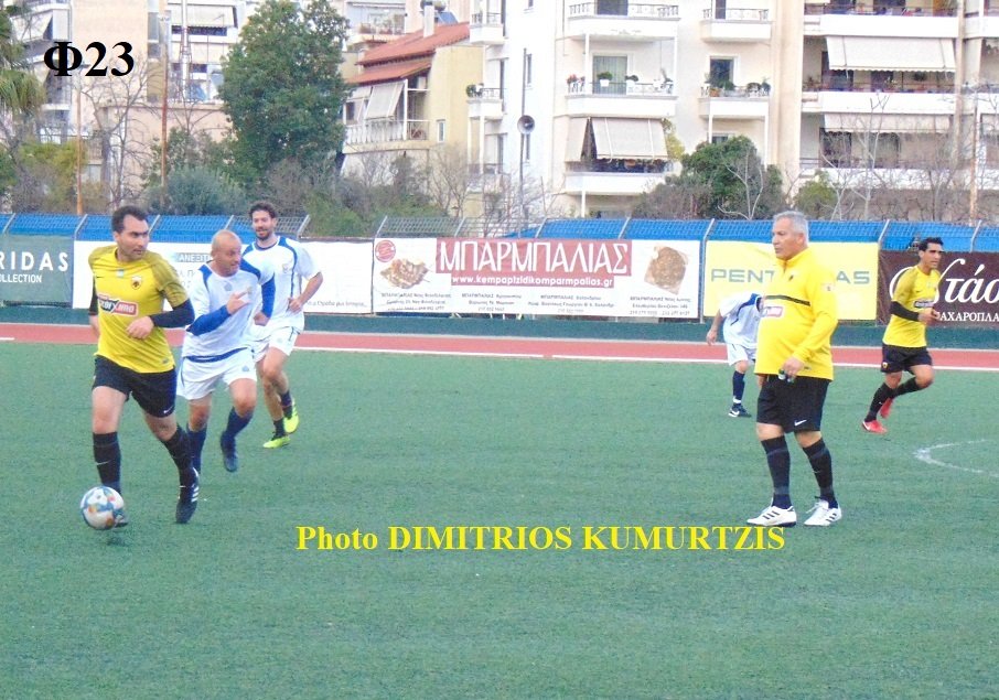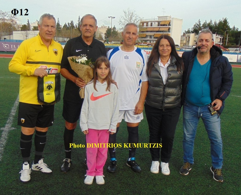 Φ12 Οι αρχηγοί των βετεράνων ΑΕΚ και Νέας Ιωνίας Λύσανδρος Γεωργαμλής και Ντίνος Ελευθεριάδης, αντάλλαξαν λάβαρα και φωτογραφήθηκαν με τον διαιτητή Γιώργο Τσιπούρα, τον παρουσιαστή της εκδήλωσης Μάνο Τζατζιμάκη και τον αντιδήμαρχο αθλητισμού Νέας Ιωνίας Σοφία Ναϊσίδου