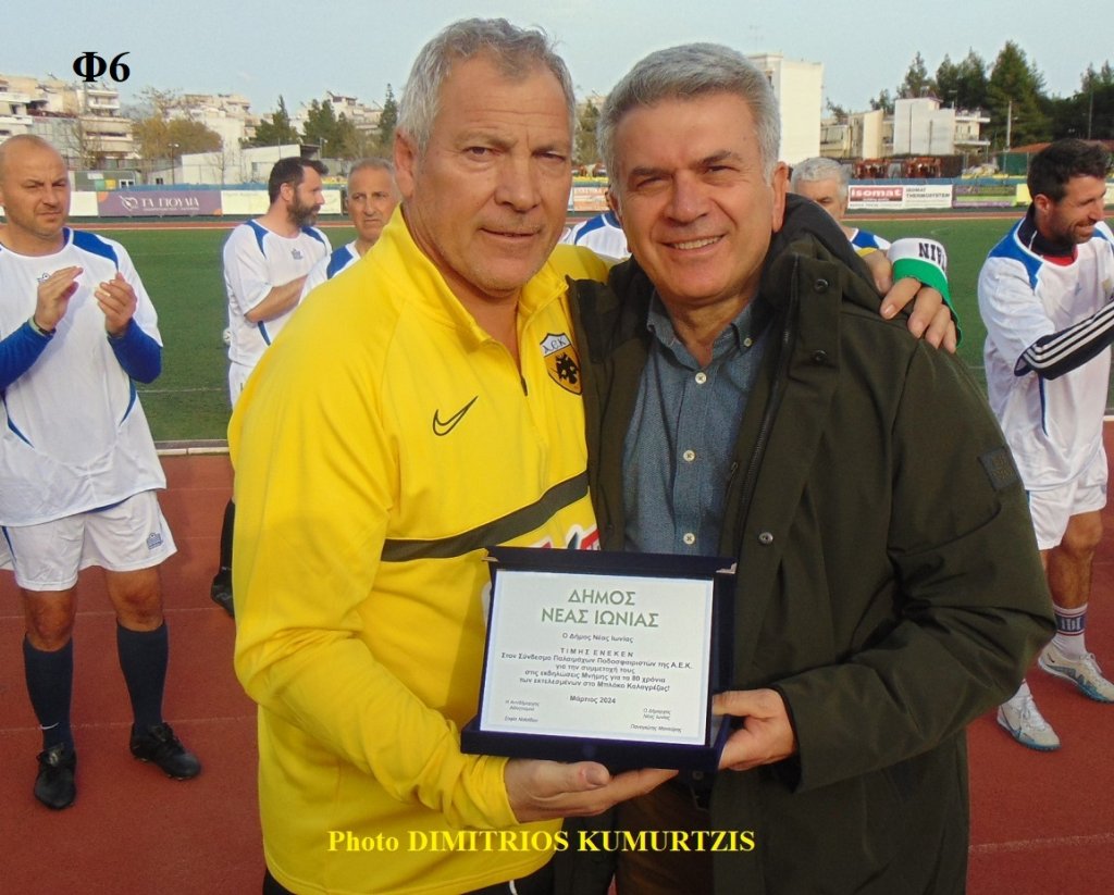 Φ6 Ο Δήμαρχος Νέας Ιωνίας Παναγιώτης Μανούρης, έδωσε αναμνηστική πλακέτα στον αρχηγό της ομάδας βετεράνων της ΑΕΚ Λύσσανδρο Γεωργαμλή