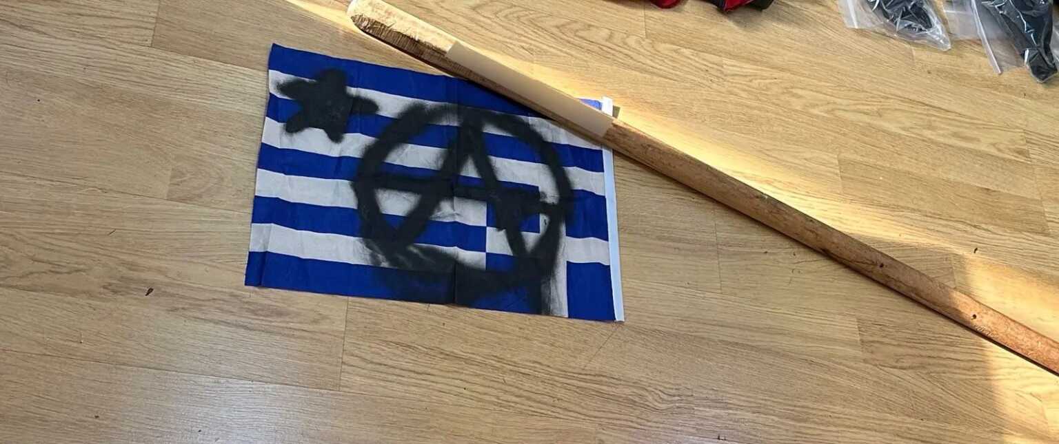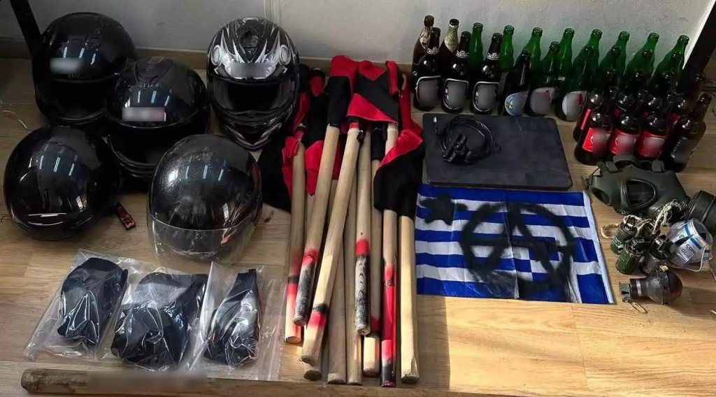 Ρόπαλα, κράνη, χειροβομβίδες κρότου λάμψης, μία καμένη ελληνική σημαία και άδεια μπουκάλια μπύρας που χρησιμοποιούνται σε βόμβες μολότοφ εντόπισε μεταξύ άλλων η ΕΛΑΣ κατά την αστυνομική επιχείρηση στις εστίες της Πανεπιστημιούπολης στου Ζωγράφου το πρωί του Σαββάτου (16.03.24).