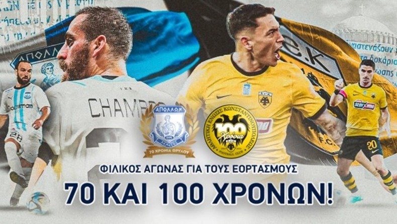 Την Τετάρτη 20 Μαρτίου, στην Κύπρο, η πρωταθλήτρια Ελλάδας ΑΕΚ και ο Απόλλων Λεμεσού θα δώσουν φιλικό παιχνίδι, για τους εορτασμούς των 100 και 70 χρόνων ιστορίας τους αντίστοιχα.